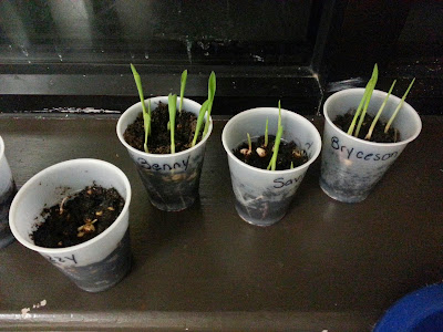 During one of our lessons on Pilgrims and Native Americans we learned that the Native Americans helped the Pilgrims plant vegetables such as corn, potatoes, and beans. We decided it would be fun to plant our own vegetable in our room so we planted corn! Look at our corn grow!